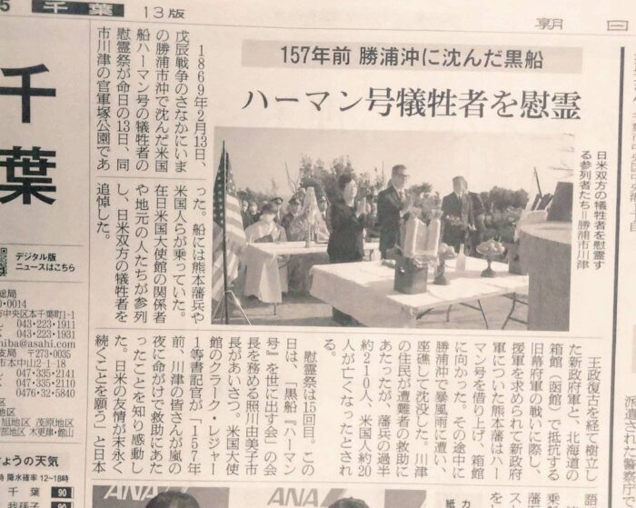 「黒船ハーマン号事件」慰霊祭 朝日新聞社様に掲載されました。